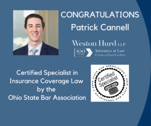 Congratulations to Weston Hurd partner Patrick Cannell on becoming a Certified Specialist in Insurance Coverage Law by the Ohio State Bar Association. Patrick joins a group of only 21 attorneys certified in this practice area in the state of Ohio.